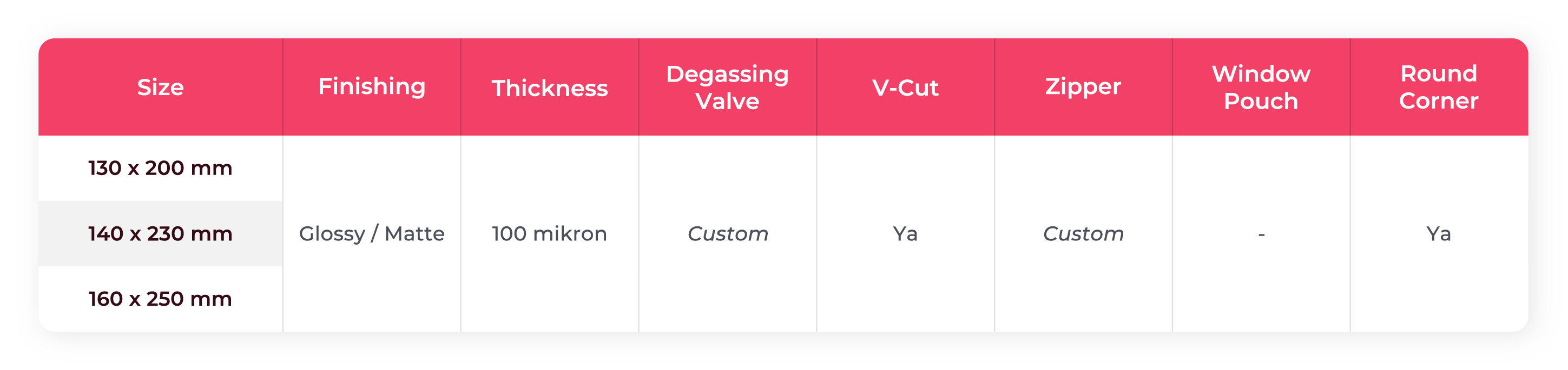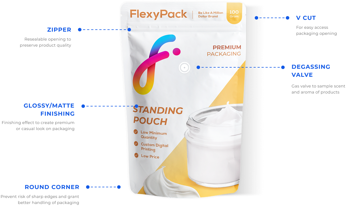 Aluminium Stand-Up Pouch from FlexyPack offers the best protection for you products. Aluminium based component consist of double layer protection to completely prevent any disruption from water, air, light, and bacterias. Aluminium allows for premium looks with metallic effect on your packagings.