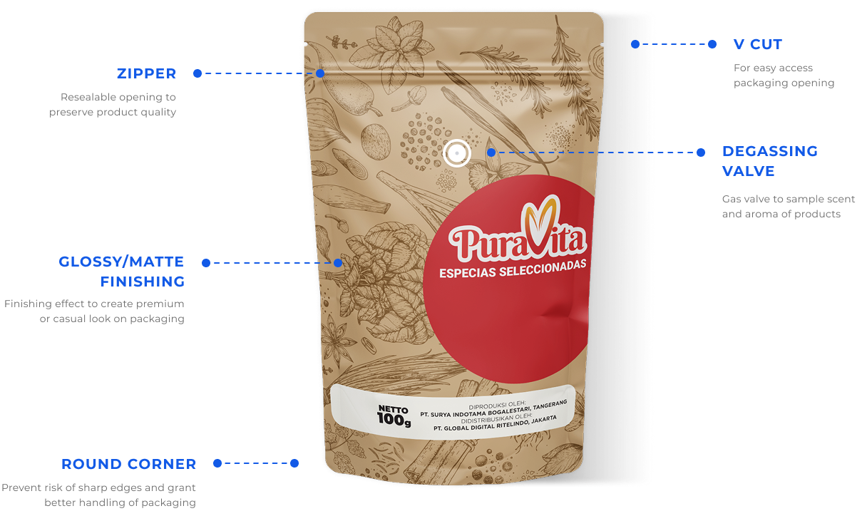 Stand-up pouch is compatible for coffee, tea, and powder drinks for display purposes as well as practical purposes with accessories support (zipper/degassing valve).