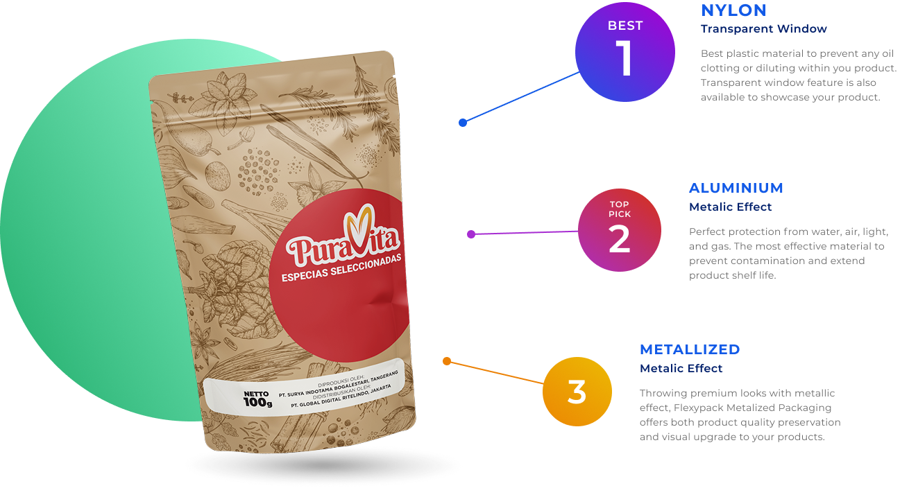 Food grade quality Packaging from FlexyPack guarantees the quality and lifespan of your herbs & spices products. With full color design and high quality material, spices and sauce packaging from FlexyPack will not only attract customers but keeping them back for more.